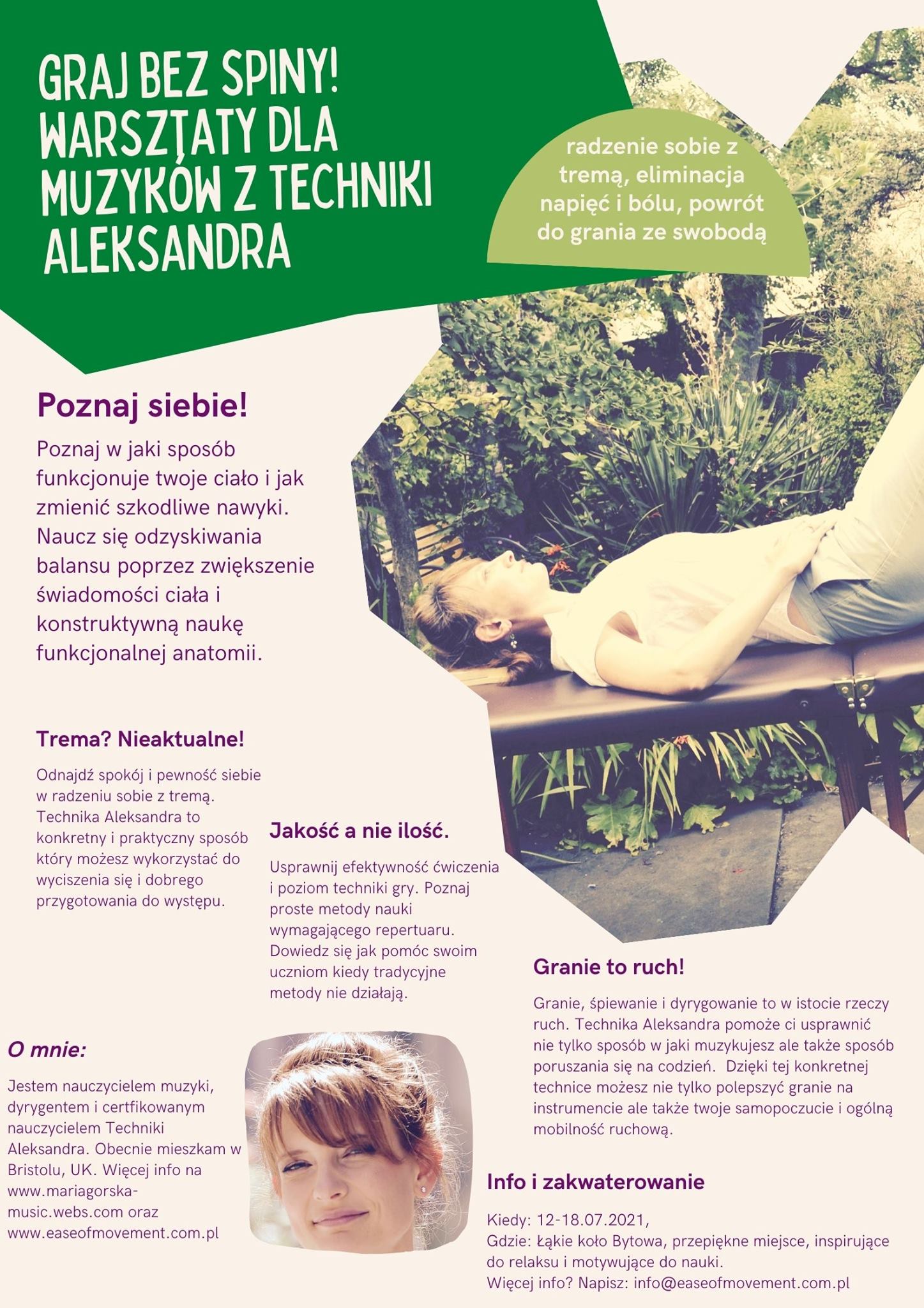 Jestem dyrygentem, nauczycielem skrzypiec śpiewu i pianina w Bristolu w Wielkiej Brytanii. Jestem również certyfikowanym nauczycielem Techniki Aleksandra. W ramach mojej pracy łączę te obie pasje– muzykę i technikę. Doświadczenie pokazuje mi że można uczyć inaczej – tak aby nie przyczyniać się do złych nawyków w grze, które potem owocują chronicznym bólem. Można również pracować nad swoim własnym warsztatem, problemami z tremą czy ze stresem związanym z nauczaniem, nie tylko przy pomocy wiedzy muzycznej, ale również wiedzy z zakresu świadomości swojego ciała. Dzięki studiom w Królewskim Konserwatorium w Walii (the Royal Welsh College of Music and Drama) miałam szansę zetknąć się z Techniką Aleksandra, która odmieniła mój sposób grania, uczenia i myślenia. Na zachodzie, większość wyższych uczelni artystycznych ma zajęcia z tej techniki w ramach swoich programów. Niestety w Polsce jest ona jeszcze bardzo mało znana. Chciałabym rozpropagowac ją również u nas, stąd idea warsztatów dla muzyków. Więcej o mnie można przeczytać na stronie www.mariagorska-music.webs.com.